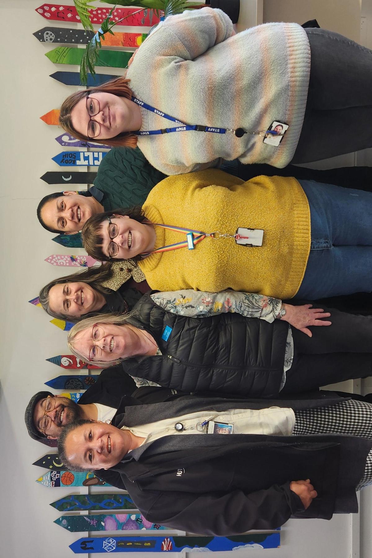 Pani works with a team of nine creative people. Megan Hindmarsh is the Pou Whakahaere/manager, Meto is the senior librarian/ senior Pou Tiaki, and Sally, Annie, Malia, Vera, and Brooke are the other Pou Tiaki.