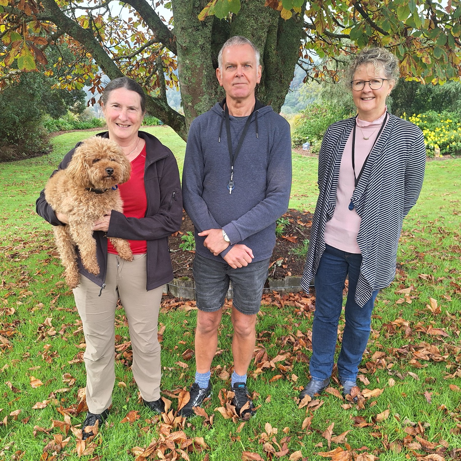 Wairakei Library Services Team, left to right: Buzby (dog), Anna Crawley (Reference Librarian), Bruce Sanderson (Document Specialist), Linda Kotze (Document Specialist)
