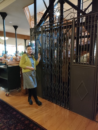 Catherine Doughty in front of the liftThe special vintage tea set the staff use in keeping with the surrounding