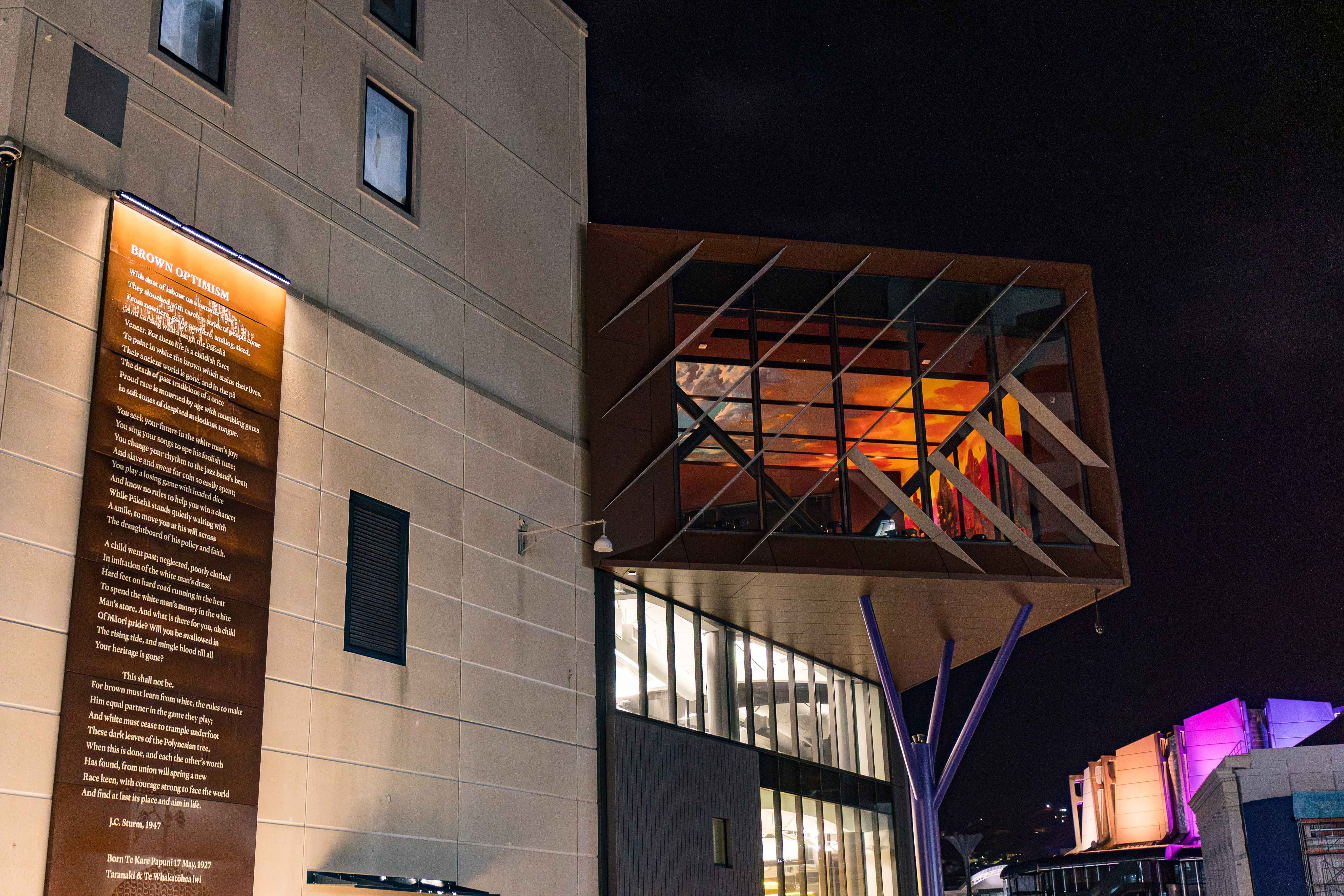 Significant rawa (artwork) populate the building. On the exterior of the building is the poem Brown Optimism by JC Sturm (Taranaki iwi, Te Āti Awa, Ngāti Ruanui, Te Pakakohi, and Te Whakatōhea of Ōpōtiki mai Tawhiti) – a powerful, political statement that demands equality for Māori and addresses the challenges of biculturalism.