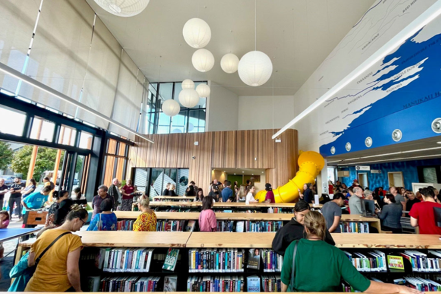 The built environment embraces community aspiration through design. Our fully functional whare kai is the heart of our facility, a kitchen which provides a platform for whānau to connect with each other over a cup of tea and gives kaimahi the opportunity to move beyond transactional interactions with customers into the relational vā. In our rūma mātua (parenting room) parents can care for their tamariki in whatever way suits them. Our wāhi tamariki is where children can engage in active play, inviting noise and movement into the library space. There is no workroom for kaimahi (staff) at te Paataka Koorero o Takaanini. They share the open space with whānau and users, holding meetings, planning, and training where the community can give feedback in real time, allowing for open dialogue and input at every step of the process.